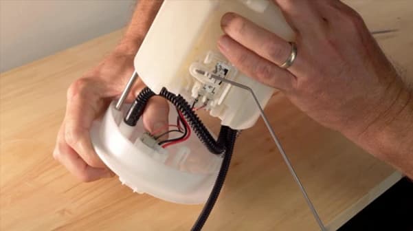 Next, connect the fuel line to the swirl pot, check that all of the clips are fully engaged and all of the electrical connectors are clipped in, and from there you can refit the assembly to the fuel tank.