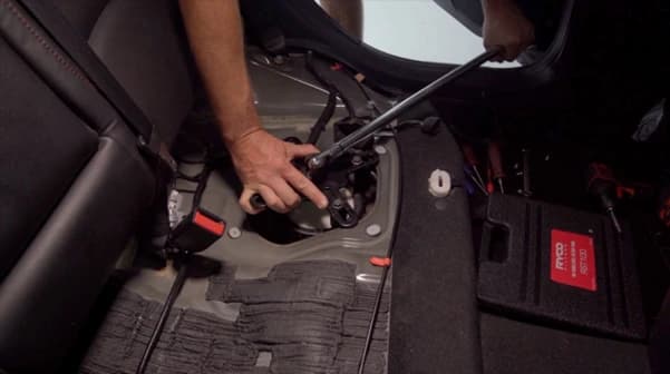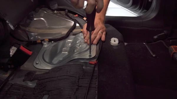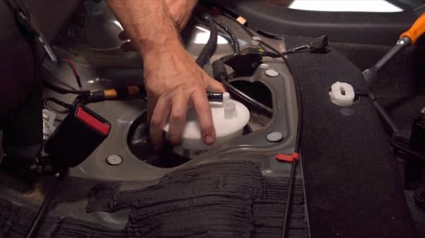 First, take note of the position of the vehicle’s fuel gauge before the service. From there, you’ll need to remove the rear seat to access the Mazda3 fuel pump assembly. Once the rear seat has been removed, you be greeted with the access panel to the fuel tank. You’ll then be able to undo the screws for the panel, giving you access to the Fuel Pump Sender, and disconnect the pump wiring and the high-pressure fuel line.
