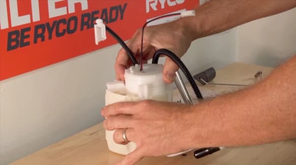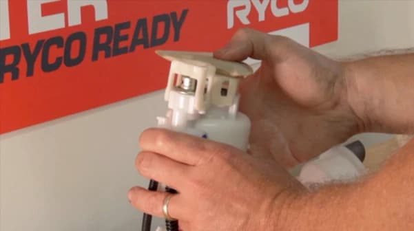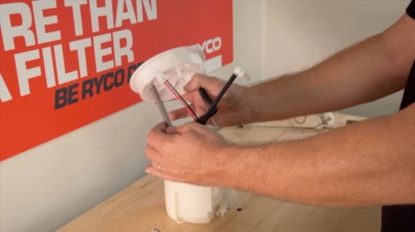 Moving on to reassembly, take the new Ryco Fuel Filter housing and fit the fuel pressure regulator. Then, feed the fuel pump wiring harness up through the filter housing and locate the fuel pump into position. From there, you can take the fuel sock bracket and reclip it to the bottom of the new Ryco Filter housing.