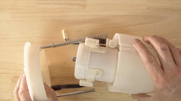 Now, you can set the assembly on a bench to disassemble the pump and change the filter. First, undo the electrical connectors from the sender unit and remove the fuel gauge float from the swirl pot. Then, remove the retaining clip from the sender unit connecting rod and remove the sender unit from the swirl pot, discarding the old spring and clip.