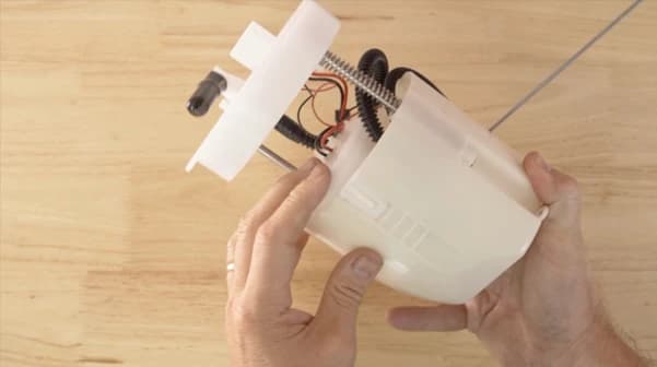 To remove the pump from the fuel filter housing, there are five clips holding the pump into the assembly at the bottom. Undo the clips, setting the filter bracket and sock aside as they will be reused as well, and slide the fuel pump out of the fuel filter housing.