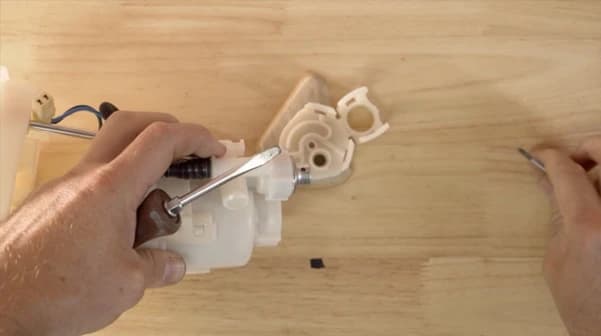 Next, remove the fuel pressure regulator from the filter housing using a flat-blade screwdriver. The old fuel filter housing and sender unit can be then discarded.