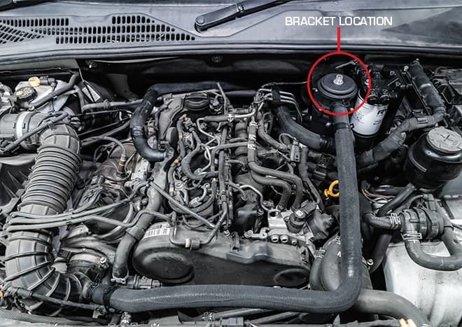 The bracket for the fuel water separator and catch can is located in the back right hand corner of the engine bay. More detail is outlined in the fitting instruction.